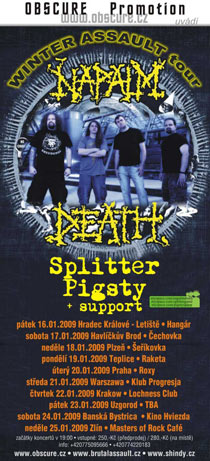 Rok staré česko-slovenské turné NAPALM DEATH hlásí své pokračování! Kultovní britská formace potvrdila na druhou polovinu ledna 2009 účast na "Winter Assault Tour 2009", které bude tentokrát čítat 10 koncertních štací, mezi nimiž figurují i zastávky v Polsku a Ukrajině. Celého turné se jako support zúčastní švédští grindeři SPLITTER a domácí zástupci v podobě brněnské chásky PIGSTY. Každý koncert vždy obohatí ještě jedna lokální formace.