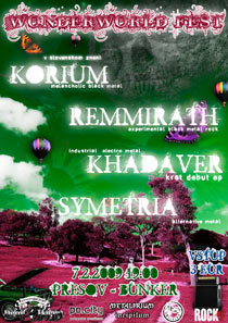 O 19. hodine na brány prešovského BUNKRU zaklopká východniarom už známa Symetria, ktorú si publikum obľúbilo hlavne vďaka ich neortodoxnému prejavu a kombináciou nespočetných žánrov od thrash, black, cez doom metal až po rock... Ako druhá sa predstaví svojím štýlom naozaj bizarná bratislavská zostava REMMIRATH, ktorá si odvážne dovolila skĺbiť black metal a rock, a mnohí si spoluznenie týchto štýlov nedokážu predstaviť ani vo sne... Patríte medzi takýchto ľudí? Neváhajte a príďte sa presvedčiť, že sa to dá a stojí to za to!!! Tretím horúcim kandidátom na zisk trofeje "TOTAL MADNESS" bude na hudobnej scéne neustále napredujúci KHADAVER - industrial-elektro metal. Neboli ste dlho na diskotéke? Nech sa páči! "Elektronické koňare" vám predvedú, čo je hudba budúcnosti - elektronika s doprovodom gitary a basy doplnené o mimocivilizačný škrekot uja speváka. Táto kapela má pre svojich priaznivcov pripravené aj malé prekvapenie a to KRST DEBUTOVÉHO EP. Keď už všetko po oslavách utíchne, na scénu nastúpi vrátiť všetko do "normálu" trenčiansky KORIUM a upokojí to melancholic black metalom na dobrú noc po nevšednom večeri plného divov zvanom - WONDERWORLD!