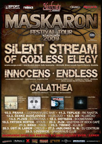 Zveme Vás na první velké české festivalové tour MASKARON FESTIVAL TOUR za účasti hlavních představitelů současné české Gothic/Doom/Metal/Rock scény SILENT STREAM OF GODLESS ELEGY + INNOCENS + ENDLESS + CALATHEA. Toto turné je zároveň realizováno jako mediální podpora letního Gothic/Dark/Metal/Rock festivalu MASKARON OPEN AIR 2009, který proběhne v Králově Dvoře (u Berouna) na nádvoří místního zámku v Sobotu 6.6.2009 a bude zároveň oslavou 6. roku fungování NOSFERATU Underground Gothic Shopu www.nosferatu.cz jako nejlepšího českého shopu s temátickou módou a doplňky.