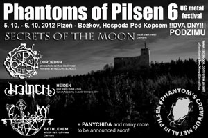 Zároveň se pracuje na oficiálním festivalovém webu, který spolu s Facebookem bude hlavním zdrojem informací. Podstatné info o účinkujících kapelách najdete také na webovém portálu Mortemzine.net. Na recenze a články vystupujících kapel vás budeme průběžně odkazovat a o všech dalších aktivitách budeme průběžně informovat. Nezapomeňte také „lajknout“ náš FB na www.facebook.com/crew.pilsen. I zde se budete dozvídat více a více… Oficiální FB událost najdete zde: www.facebook.com/events/327489907315791. Nyní je na čase oznámit první kapely, které letos na Phantoms of Pilsen 5.10. a 6.10.2012 vystoupí. A rovnou začneme „velkými jmény“. Jednou z hlavních kapel POP6 budou momentálně, vzhledem k vydání nového alba „Seven Bells“, velice aktivní SECRETS OF THE MOON z Německa, kotvící u magického labelu Prophecy records – Lupus Lounge. Pokud si některé kapely na okultno jen hrají, SECRETS OF THE MOON jsou jeho opravdovým ztělesněním. Zcela originální pojetí black metalu a jeho spřízněných žánrů.