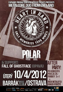 Heart In Hand jsou relativně mladou kapelou z britských ostrovů, která hraje rychlý, hlasitý a zároveň silnými melodiemi nasáklý hardcore. Mají za sebou self-titled EP(2008) a první řadové album Only Memories(2011) a koncerty a turné s kapelama jako Carpathian, For The Fallen Dreams, Dead Swans nebo It Prevails. Nicméně jejich muzika si i přes to získala velké množství fanoušků a budou zárukou kvalitního vystoupení. Na svém letošním turné jsou doprovázení dalšími Brity a to kapelou Polar, kteří všem návštěvníkům nabídnou moderní hardcore v duchu starších Gallows. Máme se tedy určitě na co těšit! Otevírat celý večer pak budou opavští The Fall Of Ghostface ,kteří se na podiu představí poprvé od půlroční pauzy a nahrávání nového EP. Tato kapela patří k tomu nejlepšímu, co lze v tomto regionú nalézt a zcela po právu tak bude vystupovat s těmito špičkovými kapelami. www.youtube.com/watch?v=Z293tG4-488