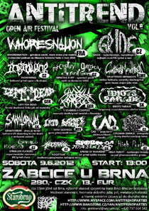 Začněme zahraničními akvizicemi – z Francie zavítá kapela, která si svou šílenou a energickou show před dvěma lety podmanila trutnovské pódium na Obscene Extreme Festivalu, grindující sypači WHORESNATION. Po sedmé za sebou se na Antitrendu se svým death/grindem představí švédští sympaťáci SPLATTERED MERMAIDS, skládající se ze členů či ex-členů kapel takových zvučných jmen jako jsou Deranged, Visceral Bleeding či RazorRape. Z Německa se můžeme těšit hned na 2 bandy - na taneční death/grind úchyláky 5 STABBED 4 CORPSES a na u nás poměrně (zatím) neznámé LEFT FOR DEATH, kteří ovšem jistě překvapí svým vysoce kvalitním death metalem ve stylu Dying Fetus a jim podobným. Po loňském osvěžujícím vystoupení kapely Porno Infantil, má po roce opět zastoupení mexická škola tvrdé hudby a to v podobě bordeliózních INTO SICKNESS. Slovenskou scénu zastupují hned 4 zajímavá seskupení - crustoví IDIOTS PARADE s dívčím vokálem (resp. řevem), nebo dnes již téměř kultovní US Brutal Death v podání pacientů SANATORIUM, kteří v posledním roce výrazně omladili svoji sestavu a můžete se tak těšit na jejich krkolomným slam válec. Pod hlavičkou „Made in Slovakia“ si můžete užít také partičku výpitků SPERM OF MANKIND, kteří však patří k absolutní středoevropské špičce v goregrindovém ranku a také na neméně populární hyperenergický trash/violence v podání ČAD. Největším tuzemským lákadlem letošního ročníku jsou bezesporu crustoví rychlíci GRIDE. Jejich jméno má silný zvuk daleko za hranicemi naší země. Od další sebranky z jihu Čech, kultovních INGROWING, se dá očekávat jak jinak než porce rychlého a kvalitního grindu. Opět nebude chybět ani „domácí“ banda s nejdelším a nejblbějším názvem - MINCING FURY AND GUTTURAL CLAMOUR OF QUEER DECAY. Stálice scény, která si drží svůj vysoký standart již více jak deset let, vás rozbije strhující show a vždy precizními výkony vokálního dua. Deathcorový prapor ponese brněnská energií nabitá CINZANA BIANCA (u jejichž veselého setu se rozhodně nudit nebudete) a především progresivní banda NOOSTRAK, která vás svým sofistikovaným deathcorem jistě nenechá v klidu. Experimentální a osobitý hc/grind navíc doplněn šílenou choreografii předvede brněnská cháska SPINELESS FUCKERS. Kapela je těsně před vydáním nové desky s názvem Funny Games, určitě se tedy bude na co těšit. Celý festival budou otevírat grindové naděje HIGH PURITY, dostavte se tedy na čas, celá taškařice totiž vypukne již ve 13:00. Pochopitelně nebude ve festivalovém areálu chybět jak bohaté distro, prodej triček, mikin, CD, nášivek až po schopnou organizační stránku, kvalitní technické/zvukové zázemí, profesionální osvětlení a samozřejmě kvalitně obsazený line-up (což již ostatně bylo podrobněji zmíněno výše). Přímo v areálu je možnost stanování a pořadatelé zaručují přátelskou atmosféru pro pijácké radovánky až do ranních odjezdů vlaků, jak tomu ostatně bývá zvykem každý rok. Nenechte si proto ujít ANTITREND OPEN-AIR FESTIVAL vol. 8, jež se koná v sobotu 9. června v Žabčicích u Brna za pouhopouhých 280,-Kč, příp. 13 EURO. Kdo si chce ještě před letošním Obscene Extreme Festivalem užít kvalitní porci především deathu, grindu či crustu, má jedinečnou možnost. Na téhle akci chybět rozhodně nemůžete! Splácal dokupy Ginger Amore