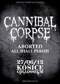 Košický klub Collosseum zažije další z velkých večerů. Ve středu 27.06. zde vystoupí trojice kapel v čele s americkou deathmetalovou legendou CANNIBAL CORPSE! Zbývajícími dvěma kapelami jsou pak deathcoristé ALL SHALL PERISH (usa) a Belgičtí deathmetalisté ABORTED. Vstupenky na tuto koncertní událost jsou k dostání buď přímo v klubu Collosseum nebo v předprodejní síti Ticketportal. Více informací naleznete na webu www.obscure.cz.