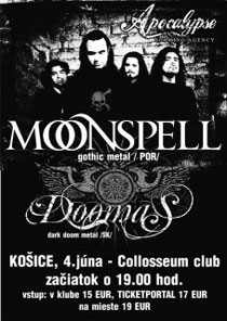 Na rozdiel od festivalových vystúpení, MOONSPELL v Košiciach majú odohrať plnohodnotný set, k čomu pripočítajte klubovú atmosféru a dostanete výnimočný zážitok pre všetkých fanúšikov tejto skvelej kapely, ktorý si nepochybne koncert dokonale vychutnajú! Ako predkapela sa predstaví výborná slovenská dark/doom metalová kapela DOOMAS. Vstupenky na tento koncert, ktorý sa uskutoční 4.6. 2012 v košickom klube Collosseum, je možné zakúpiť v predpredaji v sieti Ticketportal za 17 eur alebo priamo v klube za 15 eur.