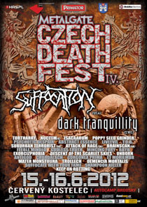 Line-upu třiceti skvělých kapel vévodí mistři moderního metalu a jedni ze zakladatelů tolik populární tzv. götherborgské školy melodického death metalu, švédští DARK TRANQUILITY, kteří opanují hlavní čas pátečního večera. Možná ne zlatým, ale za to notně krvavým hřebem sobotního večera, bude zase rdousivá mlátička ze Států, a sice SUFFOCATION. Jako každý festival, ani ten náš nezůstal ušetřen několika změn v sestavě, věříme však, že náhradníci za pár vypadnuvších jmen jsou více než důstojní - prasáky PIGSTY nahradí pražští grindeři SHAMPOONKILLER. Deathmetalisté MARTYRIUM CHRISTI bohužel přerušili činnost, nicméně náhrada v podobě věhlasných GODLESS TRUTH je jistě více než dostatečná. Kapela svým progresivním deathovým soundem koneckonců může konkurovat i světovým špičkám. Line-up navíc doplní i vítězové letošního již třetího ročníku MetalGate Massacre, prohnilí KEEP ON ROTTING. Kompletní line-up, v němž nechybí tuzemské stálice jako death metalisté TORTHARRY, extrémní ISACAARUM, elektroničtí LIVEEVIL, pro změnu folkoví CRUADALACH, POPPY SEED GRINDER (death jak řemen), GORGONEA PRIMA (industriální black metal) či lesní raraši TROLLECH, ale i hosté jako grindoví ATTACK OF RAGE či španělští satanáši NOCTEM, si můžete prohlédnout na webových stránkách festivalu www.czechdeathfest.cz. A nehudební radosti? Pravidelní návštěvníci festivalu dobře vědí, že Autocamp Brodský nabízí velmi příjemné a pohodové zázemí včetně možnosti stanování u rybníka, restauraci otevřenou do časných ranních hodin, pivní speciality partnerského pivovaru Primátor a samozřejmě bohatou nabídku metalového merchandise. Plánujeme nabídnout stejně jako minulý rok autogramiádu obou světových hvězd. Chybět nesmí ani soutěže o volné vstupenky na letní bouři MetalGate Czech Death Fest 2012. Ty nejbližší se rozjedou v druhé polovině května na metalových webzinech Abyss a Aardvark, a rovněž na Reactor TV. Začátek pátečního line-upu začíná od 15:00, v sobotu začínáme již dopoledne - v 10:00. Předprodej vstupenek je v plném proudu, a sice buď online na Tortharry shopu (www.tortharry.com), nebo osobně v kancelářích MetalGate/MMC Praha, Novodvorská 994/138, Praha 4, či v tradičních předprodejních sítích. Kompletní informace o festivalu najdete na www.czechdeathfest.cz. Všechny vystupující kapely i organizační tým MetalGate se na vás již těší!