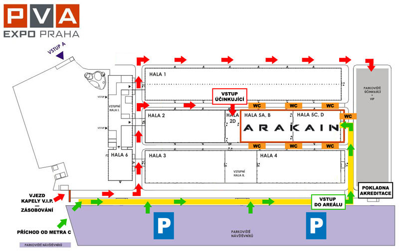 Parkování je možné přímo u vstupu do areálu na velkokapacitním parkovišti. Na parkoviště se vjíždí z křižovatky Prosecká x Tupolevova. Vstup do areálu a haly bude možný už od 17 hodin. Od této doby bude zároveň otevřena i pokladna. K dispozici je všem návštěvníkům pochopitelně i šatna, kterou naleznou v hale u vstupu. Stejně tak od 17 hodin bude na místě i shop Arakainu, v němž je připravena doprodejová akce. Fanoušci si tak mohou za speciální ceny zakoupit CD, které budou od 49 Kč a trika od 99 Kč. Vše platí do vyprodání zásob. Krom toho budou do prodeje uvedeny nové modely trik a mikin, spojené přímo s výročním koncertem. Místa k sezení jsou v hale umístěna v jedné polovině a celkově mají kapacitu cca 2000 osob. Nejsou číslované, proto budou obsazovány do vyčerpání kapacity. Pro větší pohodlí jsou nyní vstupenky k dostání ve všech zásadních předprodejních sítí v ČR. 26. 10. 2012 - PVA Expo Letňany PRAHA - Arakain, Lucie Bílá, Petr Kolář a další hosté v rámci Arakain Tribute bloku. Více informací: