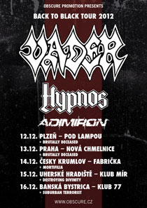 Obscure promotion doporučuje: Zapomeňte na předvánoční běsnění na některém z česko-slovenských koncertů deathmetalových legend VADER (pol) a HYPNOS (cze)! Právě tyto kapely se představí na krátkém klubovém turné, jež odstartuje 12.12. v Plzni a postupně se prožene přes Prahu, Český Krumlov, Uherské Hradiště a Banskou Bystricu. Vstupenky na všechny koncerty jsou k dostání ve všech běžných předprodejích, bližší informace naleznete na www.obscure.cz.