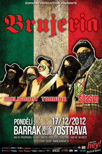 V pondělí 17. Prosince zažije ostravský Barrák invazi extrémního metalu. Se svou show zde nepřijede nikdo jiný než „superkapela“ BRUJERIA z Mexika. Co k této sebrance dodat? Extrémní kapela opředená tajemstvím…. je ta uřezaná hlava na obalu alba Matando gueros pravá? Každopádně co se ví, je, že kapelu v roce 1989 založil Dino Cazares z Fear factory. Hráli v ní například Nicholas Barker (Cradle of filth, Dimmu borgir, Lock Up), Billy Gould (Faith no more), Raymond Herrera (Fear factory). V současné době tvoří sestavu Pat Hoed (Asesino), Jeffrey Walker (Carcass), Shane Embury (Napalm death, Lock Up, Venomous concept) a Adrian Erlandsson (At the gates, Paradise lost). Jedná se tedy o velmi hvězdnou sestavu, která dokáže vyprodukovat parádní show.